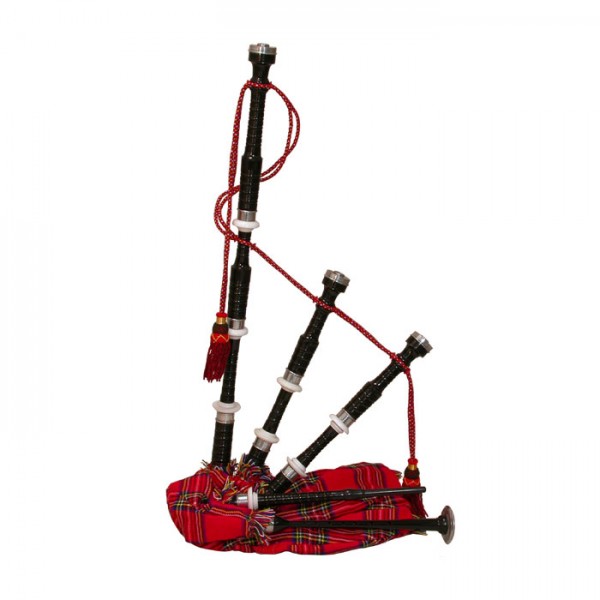 Black rosewood. Synthetic bag with Royal Stewart Tartan cover and turned nickeled ferrules and sole. Includes 2 sets of reeds, a set of stoppers, and hemp...