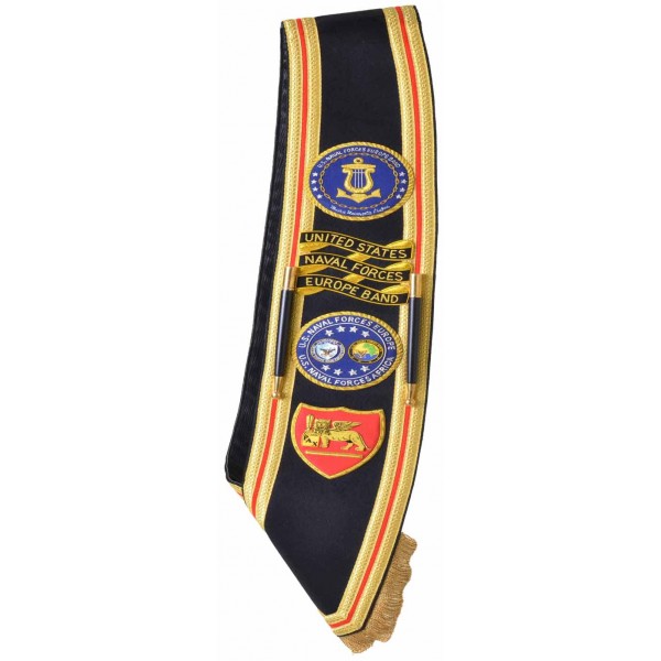 This gold on cadet blue background hand embroidered baldric sash was custom made for a US Navy Force Europe band.