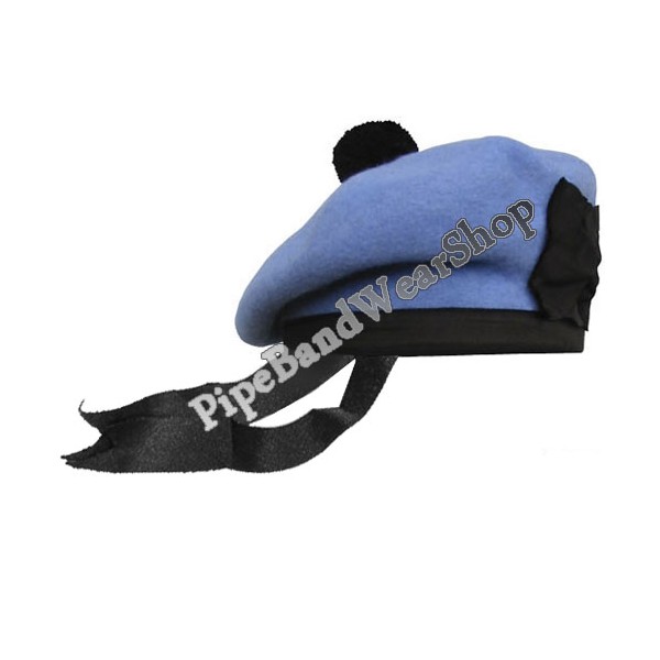 Scottish Balmoral bonnet sky blue pure 100% wool fully lined for comfort traditional construct with black toorie pom pom on top of the hat...