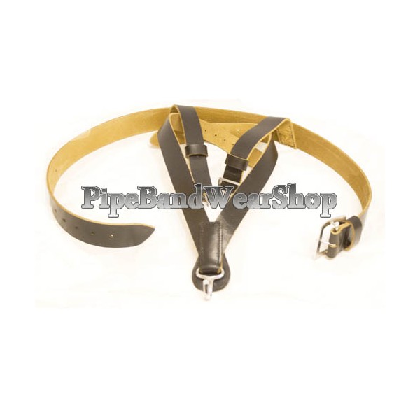 This Dark Brown Leather Bass Drum Harness an adjustable belt and shoulder straps and 2 angled straps attached at the back with fitted. 2" belt which fastens at the front adjustment up to 46", 'V' piece goes around the neck & over each shoulder, the straps cross over at the back & then attach to the buckles on the belt.