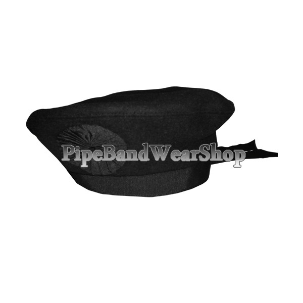 Irish caubeen bonnet black pure 100% wool Two piece body construction, Black silk lining, Black silk trim, Black silk tail ribbons, Black silk badge backing rosette.