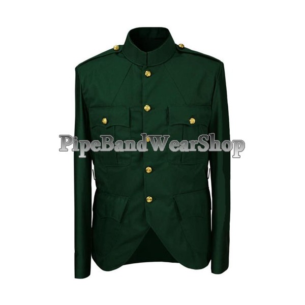 Green Cotton Cutaway front kilt tunic, Pleated chest pockets, 5 medium gold thistle button front, 3 buttons on cuffs, Cutaway front, Inside left pocket, 2 inch standup collar, Epaulettes...