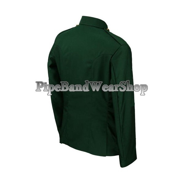 Green Cotton Cutaway front kilt tunic, Pleated chest pockets, 5 medium gold thistle button front, 3 buttons on cuffs, Cutaway front, Inside left pocket, 2 inch standup collar, Epaulettes.