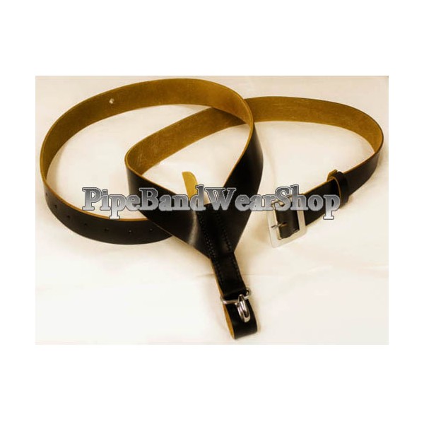 This Black Leather Bass Drum Crossove Sling an adjustable belt and shoulder straps and 2 angled straps attached at the back with fitted. 2" belt which fastens at the front adjustment up to 46", 'V' piece goes around the neck & over each shoulder, the straps cross over at the back & then attach to the buckles on the belt.