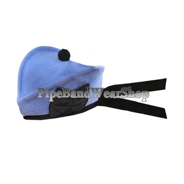 Scottish glengarry bonnet sky blue pure 100% wool black silk lining and trim, black silk 1 1/4 inch x 11 inch tail ribbons black hand made 100% wool toorie pom pom on top of the hat.