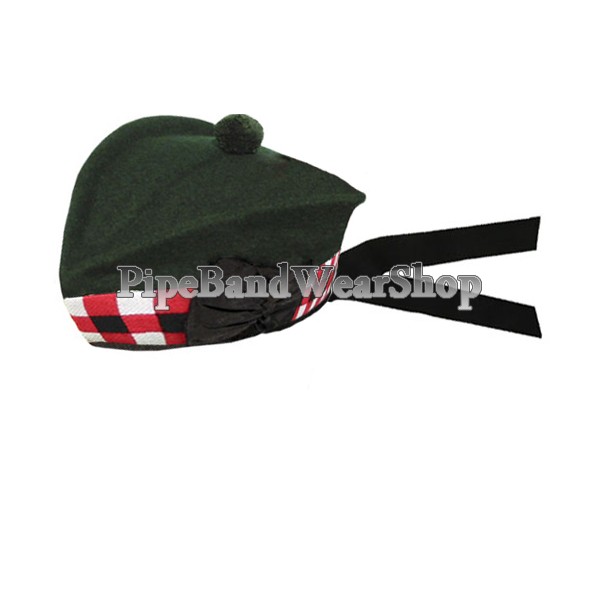 Scottish black/red/white diced glengarry bonnet green pure 100% wool black silk lining and trim, black silk 1 1/4 inch x 11 inch tail ribbons green hand made 100% wool toorie pom pom on top of the hat...