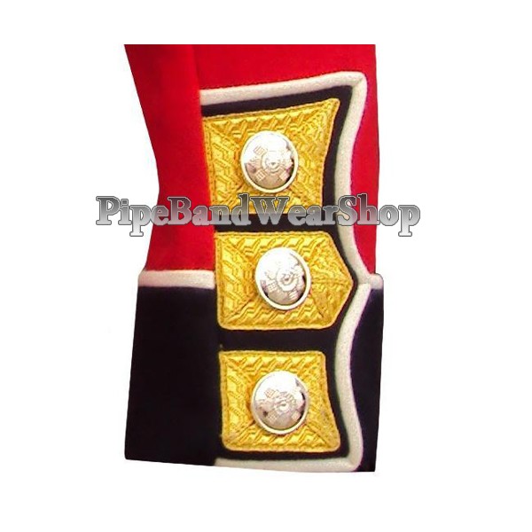 Red Melton 100% wool scots guards sergeant tunic jacket with Golden fancy braid on Cuffs, Shoulders, Collar and black piping on back complete with Buttons and Inner Satin Lining.