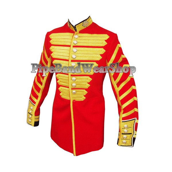 Red Melton 100% wool coldstream guards drum major tunic jacket with white/black piping on Cuffs, Shoulders, Collar and black piping on back complete with Buttons and Inner Satin Lining.