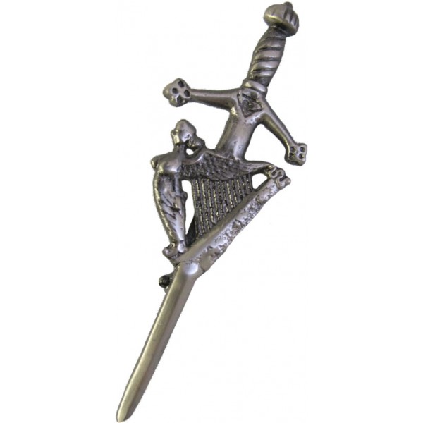 Brass Irish Harp Sword Kilt Pin, Chrome finish with celtic design on the handle and sword, pin at the back if secured by a swivel lock and size 4.5" (11.5CM) long...