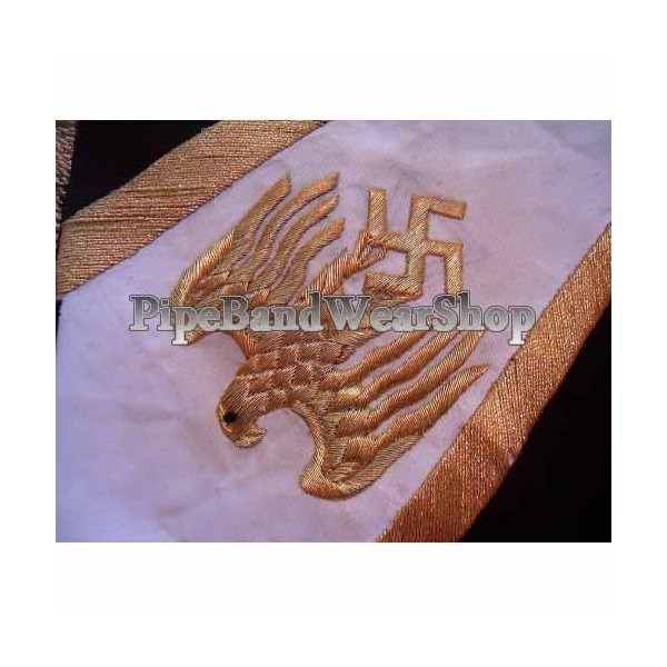 This is german banner measures approx. 23" x 23" ,including the fringe and pole sleeve and is made of a heavy cotton material. The embroidery and fringe are gold bullion.