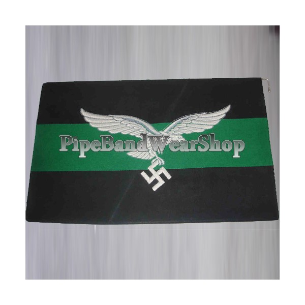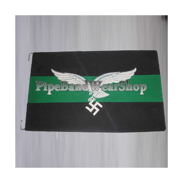 Regimental Commanders for an Infantry Regiment approximately 6½" high by 15" wide, of the Felddivsion or Division "Hermann Goering" in black cotton with horizontal, dark green median strip. Embroidered on both sides, white Luftwaffe eagle with contrasting gray plumage. Inside sided metal frame with two mounting hooks. Corroded, soiled.