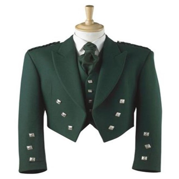 This traditional Scottish Green Prince Charlie Scottish Kilt Jacket with vest nickel plated buttons, available in 100% wool.