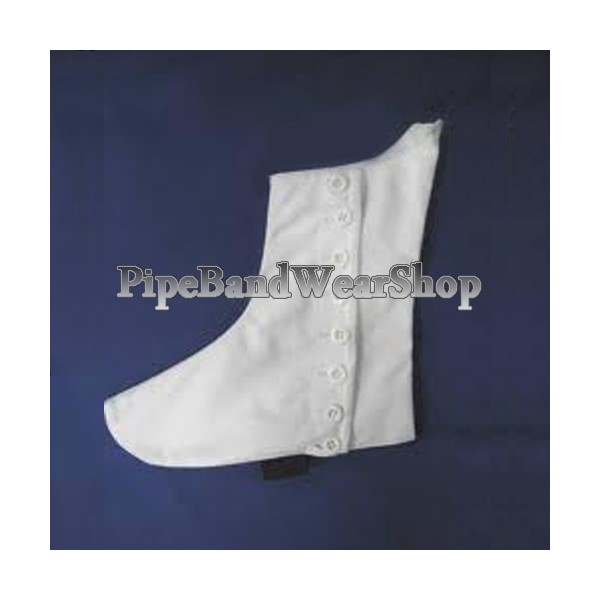 Military Spats 100% cotton canvas pure white with velcro closure, and black elastic stirrup. To determine your size: wearing your Kilt Hose with no shoes, measure the circumference of your leg at a point 9.5 inches from the floor...