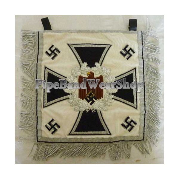 Trumpet banner nazi german army banner. It measures 16” x 16”, excluding the three-inch loops. Silk Material, Extensive Embroidery throughout with both Bullion & Cotton embroidery with silver fringe...