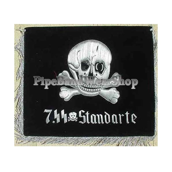 7thSS Standard Trumpet Banner 20" x 18" finest hand embroidered silver bullion on black velvet background with silver fringe...