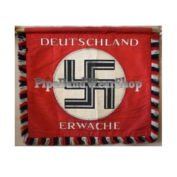 Approx. 24" by 24". Red silk material w/ two silver flat wire bullion swastikas in the center. The letters are machine embroidered. Has red white and black cotton fringe around three sides.